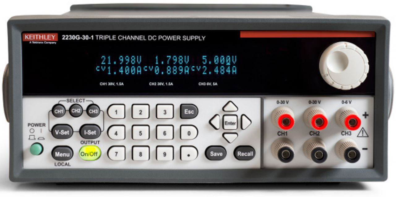 The Models 2220, 2220G, 2230, and 2230G Multi-Channel Programmable DC Power Supplies combine two and three channels of output power to cost-effectively characterise and test a wide range of devices, circuit boards, modules, and products that require more than one power source. The Model 2230-30-1 includes two 30V/1.5A channels and add a 6V channel with up to 5A output for powering digital circuits.